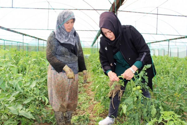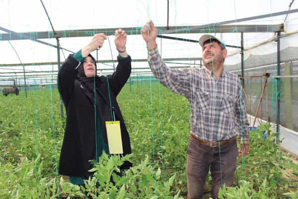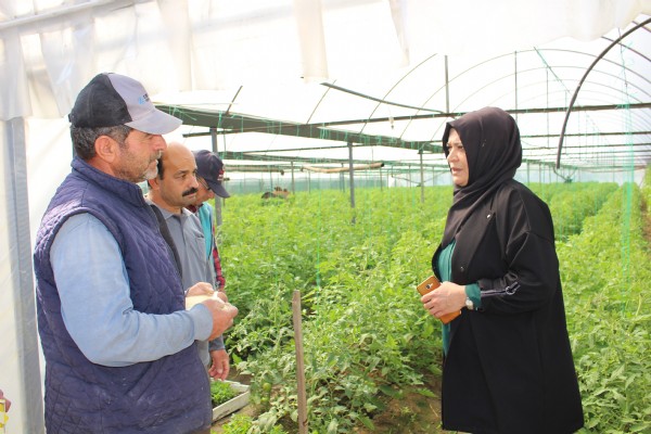 Ardından seralarda inceleme yapan mühendisler, çiftçilere zararlı böceklere karşı nasıl mücadele edeceklerini uygulamalı anlattı.
