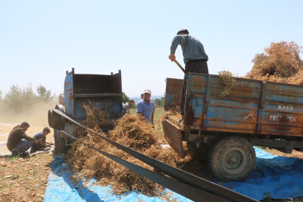 İşçiler tarafından elle topraktan çekilip 3-4 gün tarlada kurumaları sağlanan kuru bezelyelerin patozla dane ve sap kısmı ayrıştırıldı.