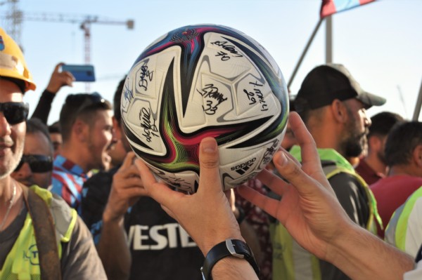 Kutlamaya katılan Akkuyu Nükleer AŞ Genel Müdür Birinci Yardımcısı ve Yapı İşleri Direktörü Sergey Butckikh, Trabzonspor oyuncularının imzalarını taşıyan ve sahaya özel olarak teslim edilen futbol topunu işçilere verdi.
