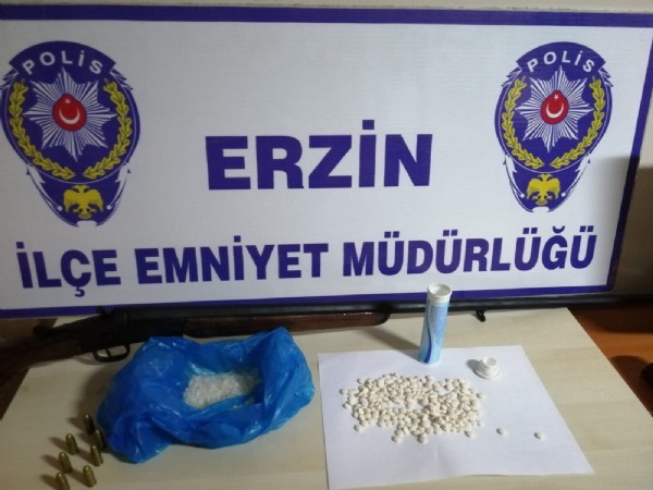 Ev, iş yeri ve araçlarda yapılan aramada, 3 kilo 900 gram esrar, 78,2 gram sentetik uyuşturucu, 244 uyuşturucu hap, tüfek ve 7 fişek ele geçirildi.