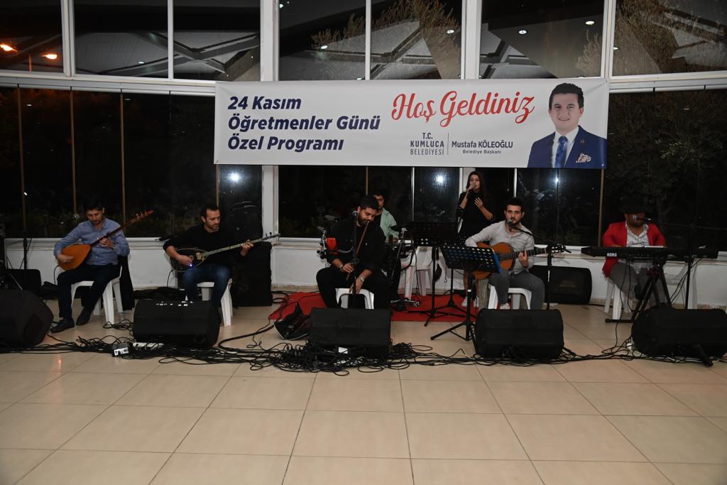 Kumluca Belediye Başkanı Mustafa Köleoğlu programa eşi Nurgül Köleoğlu ile katılarak öğretmenleri selamladı. Yoğun ilginin olduğu programa aileleriyle katılan öğretmenler KUMGENÇ Orkestrasının birbirinden güzel şarkı ve türküleriyle keyifli dakikalar geçirdi.