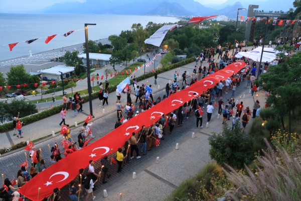 Ellerinde bayrak, döviz ve Mustafa Kemal Atatürk'ün fotoğrafları bulunan binlerce Antalyalı, Konyaaltı Beach Park girişinde toplandı.