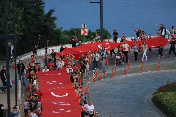 Vatandaşların büyük ilgi gösterdiği yürüyüşte, dev Türk bayrağı açıldı.